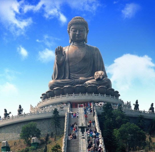 香港的天坛大佛,释迦牟尼座像,锡青铜材料,通高26.4米,重220吨,公元1993年建成。天坛大佛座落在香港大屿山海拔520米的昂平,是香港受欢迎的旅游景点之一。是全球最大的青铜座佛。佛像坐在268级的石阶上,端坐的佛像庄严肃穆,无论远观近看,都予人宁静祥和的感觉。美国权威地理旅游杂志《国家地理旅行者》极力推荐天坛大佛这项名胜。 3、西方:乐山大佛