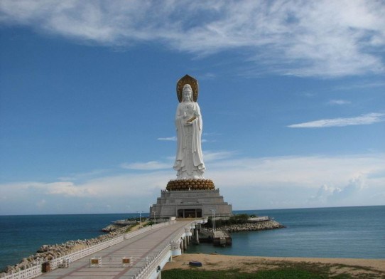 烟台南山大佛,释迦牟尼座像,锡青铜材料,位于山东省烟台市龙口市南山旅游区,2004年4月建成。高38.66米,重380吨,由232件佛体、108块莲花瓣、302个发髻、共642块锡青铜铸件组合而成,堪称目前世界第一铜铸大坐佛。南山大佛融古今中外佛像铸造艺术的精华,使古老的青铜铸造艺术和现代科技成果于一体,展现了佛教文化和现代文明的完美结合。 7、海南三亚观音
