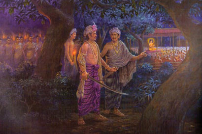 阿阇世王去见佛陀,却又心存犹豫。 提婆达多灭亡以后,阿阇世王并不因他的灭亡而悲哀,反而在他的八识田中感到这是罪有应得,原来阿阇世王已逐渐有了悔意。 有一天,阿阇世王在睡梦中见到他的父亲频婆娑罗王微笑着对他说道:“阿阇世!我是你的父亲,你虽然企图杀害我,但我不怨恨你,我是佛陀的弟子,我愿以佛陀的慈悲来原谅你。你终是做过我的儿子,我为你祝福,祝福你早日悔悟,走上光明的正道来。”阿阇世王醒来很难过,左右思维父亲的慈爱,想到自己无理的杀害父亲,感到非常的后悔。 有一天,阿阇世王和母亲韦提希夫人共桌吃饭,吃饭的时候,他没有看到儿子优陀耶,就问侍从:“优陀耶到哪里去了?把他找来一起吃饭!”侍从回答说:“优陀耶在和狗一起玩。”侍从把优陀耶叫来的时候,优陀耶的手中还抱了一条小狗,阿阇世王问他道:“你怎么不吃饭呢?”优陀耶撒娇着回答道:“没有同狗在一起,我不吃饭。”阿阇世王只得让他去,他们就共在一张桌上吃饭,吃了一会,阿阇世王对母亲韦提希说道:“我是王,为了爱儿子,居然同狗在一起吃饭,这真不好看。”韦提希国太夫人道:“同狗在一起吃饭,这有什么了不起?吃狗肉的人都有。你现在为了爱儿子和狗在一起吃,你就挖苦起来,其实你的父亲对你比这更大的事都有,不过你不知道罢了。当你在很小的时候,手指上生出痈来,苦痛万分,日夜都不能睡觉。你的父亲抱着你,把你放在膝上,用口含着你害痈的手指,所以你才能减少痛苦。有时,因为口里的暖气,你害熟了的痈中流出脓来,你父亲怕惊动你的睡眠,他只得吞下流出的脓。你的父亲是这样的爱你,为了他的孩子,别人做不到的事,他都做得出来。”阿阇世王听到母亲韦提希夫人这么一说,默默的放下饭碗,站起来,走到邻室走,他从此再也不感觉到王者的荣耀欢乐,他的心中像被一块大大的石头压着。 阿阇世王的业报现前,身上又生满很多的痈,心里不时有着悔恨的负担,他就对朝中大臣们道:“现在我的身上和心上都患了重病,一定是由企图杀害父王的罪而起的,谁能替我医治呢?”大臣中有门师外道月称等,用种种邪教企图说明为国杀父是没有罪业的话来安慰阿阇世王的心,但阿阇世王听他们的话没有动心,只有加深他的悔恨。 那时名医耆婆前来探病,问道:“大王!现在贵体觉得怎样?”阿阇世王摇头道:“耆婆!我的病很沉重,不但身体上有病,心里的病实在很苦。我想,就是有良医、妙药、咒术,都不能为我治愈的,我日夜睡在床上,忧愁苦闷,呻吟叫喊,不能入睡。耆婆!你虽是天下的名医,这一次怕你也不能救我了。”耆婆很慎重的说道:“大王!你不要这么失望悲伤,现在世界上能救大王的人除了佛陀以外,我想的确是没有第二个人了。”耆婆说这话的时候,阿阇世王的侍从人等颜色大变,他们都怕耆婆触怒王上,但是阿阇世王这次没有发怒,默默的闭起眼睛,耆婆察知阿阇世王的心就说道:“大王!我是一个医生,医生即使医治身体上的病,但决不能医治心里上的病。佛陀是无上医王,只要大王肯拜见佛陀,佛陀一定欢迎。佛陀好像无边的大海,他能容纳百川众流,大王的苦是从心生,要把心上根本的病医好,才能医身上的病。”阿阇世王点点头说道:“耆婆!你说得很对,我也想去拜见佛陀,不过我又怕佛陀因我是有罪的人而拒绝,加之我和提婆达多做的事都很对不起佛陀。”耆婆知道阿阇世王此刻惭悔的心,所以又再进一步说道:“大王!你的罪,先王在临去世的时候,我听说他已经原谅你,先王是佛陀的弟子,佛陀的弟子都能原谅你,何况众德圆满大悲普济的佛陀呢?大王!我常听佛陀讲,人若造了罪恶,怀着惭愧的心情,在三宝之前恳切致诚的惭悔,罪过就可以消除,业障也会减轻。大王虽然一时不智,造了罪业,但照佛陀惭愧忏悔的法门,大王仍然是可以得救。我看大王,现在已知道惭愧忏悔,这就是大王新生的开始。我又听佛陀讲过,有智慧的人,他是不敢造罪,就是不慎造罪以后也知道忏悔;愚痴的人,他是造罪不改,以及造罪覆藏。大王若能到佛陀的座前告折忏悔,表明不敢再犯,佛陀的慈悲之光,一定会庇佑到你。大王!智者不覆藏罪业,佛陀常说,做人要深信因果,深信业报的丝毫不爽,世界上不可救的只胡阐提,大王不是阐提,一定能获得佛陀的救济。佛陀的慈爱无量无边,惠施给一切众生。佛陀是不分冤亲憎爱,贫富贵贱,都是同等的救度。佛陀准许尊贵的跋提王子等出家,但也准许下贱的优波离出家;佛陀接受富翁须达多长者的供养,但也接受贫穷者的布施;佛陀感化不为欲染的大迦叶加入僧团,但敢方便劝贪欲的难陀披剃;鬼子母和鸯崛魔罗,别人听到名字就怕,而佛陀却去找到他们度化,佛陀对什么人,都视同罗睺罗,请大王千万不要再有疑虑!大王!我讲出来真是恐慌得很,但我又不能不忠实的告诉大王,现在佛陀带领他的弟子一起都到我的梨园中来说法,希望大王速去拜访,把心中的乌云除去,现出朗朗的晴空,这是千载难逢的机会,我恳求大王不要错过!”阿阇世王听以后,眼中放出悔改和希望的光彩,对耆婆说道:“你说的话我很高兴听,请你为我选择一个吉日良辰,我一定要前去拜访佛陀,哀求忏悔。”耆婆不以为然地摇头道:“大王!佛陀的教法中是没有吉日良辰的迷信,佛陀常常教诫诸弟子不准卜卦算吉凶。修学正法,依正法而行,什么时候都是吉日良辰,大王最好即刻就起驾动身吧!” 阿阇世王很欢喜,