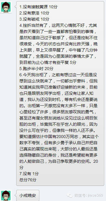 今天发一篇vip戒友的原创文章,并已经征得本人同意,首发刊登在戒色微信上。作者的文字着实真实走心和真实,作为小戒也比较佩服作者的勇气,所以必须推荐。但从文字中也透露出这个社会对待同性恋群体还是有着不解和排斥。所以本微信也呼吁大家能够以实际行动去关爱这个群体。 ———- 本文系微信jiese360 vip戒友原创,转载请注明出处。谢谢。 很久之前就一直在想这件事情,没想到这一天这么快就来了,由于之前和很多朋友也有说过这件事情,他们都表示支持,所以我也就有了说出来的勇气。近些天发生的事情让我喘不过气,实在不想再这样生活下去,所以无论如何我也要把最真实的自己展示出来,就算以后的生活面临天翻地覆的变化,我也已经准备好了张开双手迎接我新的开始。 我是同性恋! 1.这是真的吗?你没开玩笑吧? 这是真的,不管你看到现在有怎样的想法,但这就是真实的我,不管有多少人能接受这样的事实,我自己也要面对这件事,这种事情也没什么可开玩笑的,就是你看到的这样。如果你没办法接受或者觉得恶心,那就请点击返回键或者Home键。 2.你不是谈过恋爱吗?怎么会这样? 事情是这样的,我是谈过恋爱,而且在那个时候我还是一个单纯的小直男,或者更确切的说那个时候的我还没有意识到自己是个弯的,对于这件事情,我一直也觉得愧对我的前女友,她一直以来承受了很大的压力。很感谢她,能在我自以为能胜任爱情的时候教会我怎么谈恋爱,她让我明白在爱情里我们是两个齿轮搅在一起,而不是自顾自的旋转,可是爱情啊,我终究还是无能为力;感谢她,在我们分手之后能和我成为这么好的朋友,我知道在我跟她说这件事的时候她开始是没办法接受的,但一直到现在跟我逛街也开始关注弯男弯女,我知道她开始接受了,我们成为了最好的朋友,她对我的事情我们现在几乎每天都在一起,所以很多人可能会认为我们复合了,但是男女之间就不能有纯友谊吗?哈哈,我也不相信男女之间纯洁的友谊,但是现在也能解释这个问题了不是吗。 3.那你是怎么意识到自己是个gay的? 这个问题,是在我分手后几个月之后吧,怎么发现的,当然是喜欢上别人了,开始我也不能确定那种感觉是不是真正的喜欢,但时间久了我发现这和我之前喜欢女生的感觉没有区别,一直到后来喜欢上第二个,到现在的第三个,都是男的!不要太在意数量啦,毕竟都不认识,怎么可能维持很久呢?到这请你们不要脑补,我真的是去年这个时候才发现的,腐女姐姐们别太兴奋,你们调侃我的时候我还真的是个单纯的小直男。 4.你发现自己是个gay之后,自己有什么感觉? 跟大多数gay一样,不敢相信,甚至会觉得自己恶心,变态,经常问自己怎么会这样呢?但是在这件事情上,所有的gay都无能为力,只是很多人会继续掩藏自己,大部分选择和异性结婚、生子,是啊,这就是现实。但我要过我自己! 微信id:jiese360 或许就算全世界都放弃你,但我们也不会放弃你。一个专注提供戒色资讯,心理辅导的微信公众号。欢迎添加。 5.你不能再像之前一样喜欢女生吗? 这个问题我也没有办法决定,如果给我重新选择的机会,又有几个gay会选择继续做同性恋呢?但这种感觉很奇妙,我也说不出,只是随着时间的迁移我已经回不去了,我会走在街上看到长得不错的妹子感叹一下,还是会喜欢某个女明星,还会继续把我的桌面设置成我喜欢的偶像,但这些最多就是欣赏而已。 6.你是怎么想到要出柜的? 事情就是我最近喜欢了一个人,但是我生性这么高冷,怎么可能主动接触别人呢,所以就体会了那种喜欢别人的痛苦,一个月里,情绪都不稳定,看书也不能集中精力,走到哪都会注意他在不在,干什么都会想到他。我这个人是从来不吃醋的,但最近实在是太不像话了,看到他跟别人在一起就不舒服,不管是男生还是女生,我这辈子也没有过几次心痛的感觉,但是一半都献给了他,说到这我他妈就来气,每次都说下次见到他一定会骂死他,但是我…就是这么怂。这些事情让我不能呼吸,我现在的状态就是必须要听歌,耳边一没有声音就能想起他,我不能再这样继续下去了,我必须要迈出这一步,我什么都不在乎了。什么?你说我轻率,可是我一直这么轻率,高考填报志愿、考研换专业,我在这些能影响自己的大事上从来就没理性过,结果也没有很糟,所以就再轻率一次吧。 7.你父母知道这件事吗,他们会怎么想? 一写到这我的心就很沉重。毕竟我这辈子最大的软肋就是他们了,我实在不忍心看到我妈一下子从十八岁的大姑娘变成二十八,也不忍心让我爸替我操心,天下的父母谁能那么轻易接受这件事情呢,我自己可以不在乎别人的眼光,但我又怎能忍心让他们受别人指指点点呢?“你看那老李家的孩子考个那么好的大学又有什么用呢,他的孩子是同性恋,是个变态,他们家绝后…”。这件事情我会选择适合的时机和他们说,因为早晚都要迈出这一步,趁早不趁晚,我也不想等到我30岁回家过年还是一个人的时候在告诉他们这件事,这对他们不公平,早一点告诉他们意味着他们能早点接受,毕竟谁家的父母不爱自己的孩子呢? 8.你以后要怎么办? 能怎么办呢,找个男人谈恋爱。我也渴望拥有一份爱情,渴望我们能向异性恋一样去环游世界,能在大街上接吻…所以,看到这的兄弟姐妹们,身边有好的给弟弟介绍一个[偷笑]。至于择友标准嘛,怎么也得比我高吧,但也不至于来个最萌身高差,长相
