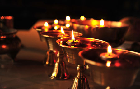 供灯之功德利益 在《大藏经》中,对供灯的功德介绍得很详细,有部经叫《佛为首迦长者说业报差别经》,里面宣讲了供灯的十种功德: 一、照世如灯。供灯者生生世世如同世间的明灯,转生为人也是人中之王,就像上师如意宝一样,慧灯照亮整个世界。 二、肉眼不坏。供灯者肉眼非常明亮,不会变成盲人,也不会成近视眼。 三、得于天眼。供灯者将来会获得五眼中的天眼。 四、善恶智能。能辨别善法和恶法,懂得一切因果取舍。现在世间上许多人极为盲目,不知善恶取舍,而供灯者的智慧超越其他人。 五、灭除大暗。具有超胜的智慧,能灭除自他相续中的一切愚痴黑暗。 六、得智能明。自己的智慧超群众人,不受外界的各种诱惑,有辨别取舍的能力。 七、不在暗处。生生世世不会转生在邪见或者黑暗的地方,住于光明的殊胜之地。 八、具大福报。转生为具有大福报的众生。世间人认为大福报就是有钱、有地位、有轿车、有房屋、有人民币或者有美金。其实我认为真正有福报的人,终生不会造罪业,具有修持善法的机会。没钱不一定是福报浅薄,一个人即生中遇到佛法,行持佛法的机会圆满,就是有大福德的人。 九、命终生天。命终后不会堕入恶趣,而会转生天界。其他经典中也说,长期供灯的人不会生于恶趣,而是上生天趣,即使投生人间,也生于高贵种族的家庭中,不会生在具邪见者的家里。我们极个别道友生长在具有邪见的家庭中,父亲的邪见如山王,母亲的邪见也极其严重,孩子以微薄的力量很难转变他们。而供灯的话,生生世世不会转生到这种家庭中。 十、速证涅盘。很快的时间中能证得圣者的果位。 另外,《佛说施灯功德经》提到:「于佛塔庙奉施灯明,乃至供养少许灯芯或酥油灯,即使此灯的亮度仅能照一台阶,而福德之大,不是声闻、缘觉所能了知,只有佛才能够通晓。」 布施灯具可得到下面四种可乐的福德: (1)相貌庄严,(2)资财充足,(3)有大善根,(4)有大智慧。 布施灯具可得到下面四种清净: (1)身业清净,(2)口业清净,(3)意业清净,(4)善友清净。 于现在世,得三种清净心: (1)明了此身不坚而求坚固的佛身,得知钱财过患而求坚固的法财。 (2)了知此善根是人天善道之因,能得妙色、资生具等。又得智慧,安隐快乐,乃至能得菩提果。 (3)施心无悭,施心增长。 于临命终时,内心可得三种明: (1)先所作福悉皆现前,忆念善法而不忘失。因此便能念知自己原先于佛塔庙所作的各种善业。 (2)命终时得如是念:「我于佛像塔庙等前,已曾供养。」作是念已,心生踊跃,便能生起念佛之心。 (3)命终时见别人布施,见已,起念:「我也曾于佛寺奉施灯明,我现在应当再行布施。」由此得欣喜心,无有死苦,因此得念法之心。 于临终时,更可得见四种光明: (1)于临终时,见于日轮圆满涌出。 (2)见净月轮圆满涌出。 (3)见诸天众一处而坐。 (4)见如来坐菩提树下即将证菩提,见己身尊重如来,合掌恭敬而住。 于未来世中,得八种可乐胜法: (1)获胜肉眼。 (2)得于胜念,无能测量。 (3)得于胜上,乃至获得天眼。 (4)为能圆满修集道故,得不缺戒。 (5)得智慧圆满,证得涅盘。 (6)先所作善得无难处。 (7)得值诸佛,能为一切众生之眼。 (8)得为转轮王,所得轮宝不为他障。其身端正,或为帝释,得大威力,具足千眼;或为梵王,善知梵事,得大禅定。以此回向菩提善根。 供灯之仪轨: 寺庙里都有一套完整的供灯仪轨,在家居士们可以采用以下的简单仪轨来进行供灯: 一:洗净双手后点燃明灯,然后手持灯具念到: 三宝弟子xxx今日以此供灯,上供十方三世诸佛世尊,诸大菩萨,普遍滋润法界众生! 二:随后放下灯,双手合十。念不空摩尼供养真言二十一遍或者一百零八遍。然后观想因为此咒语之作用,让此灯变成了无量盏,随之念到:愿此灯化成无量盏,一 一佛前各亮亿盏灯! 愿此光明消除三有之顶以下到极苦地狱以上所有的无明与黑暗:愿十方三世一切诸佛菩萨的净土都显现亲见! 嗡班杂阿罗给阿吽(一遍) 三:念供灯祈愿文: 殊胜无量光明灯贤劫千佛诸圣众 十方广大佛净土上师本尊护法众 坛城圣众我供养父母为主有情众 生生世世各方所皆能亲见佛净土 愿与弥陀合为一三宝圣众三根本 以清净力发此愿祈速成就赐加持 爹雅他 班杂只雅 阿哇布达 那耶梭哈! 最后回向,根据佛经记载,施灯之人命终之后升天,可是末学向往的是西方极乐世界,故此我采用的是以下的回向文: 愿以此功德,庄严佛净土;上报四重恩,下济三途苦;若有见闻者,悉发菩提心;在世富贵全,往生极乐国。南无阿弥陀佛! 南无十方三世一切佛,一切菩萨摩诃萨! 供灯之注意事项: 一:每次供灯前,都要洗净双手。 二:时间上的要求:一般来说全天候都可以供,但末学一般都是晚上和早上供。 三:灯油一般采用可以食用的植物油,但绝不能用动物油。 四:不能用嘴吹灯,要灭灯时,末学采用的是净纸湿水后盖在火苗上瞬间既熄。 五:注意防火! 六:供灯的数量。 以清净心供一盏灯的功德都难以描述,不要说供十盏灯或者百千万盏灯了。所以希望你们应该发心,尽量在佛前供灯。 |