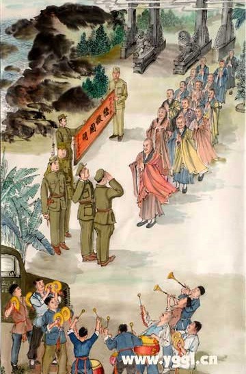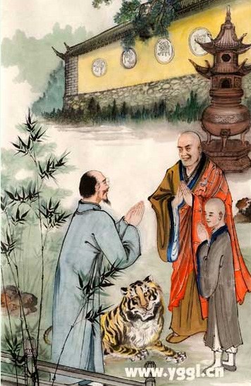 画虎专家 牵虎拜谒 一九三六年全国著名画家张大千之兄张善子,擅长画虎,将自己在苏州狮园养的一只老虎牵到大师跟前,让大师给老虎说三皈依并赐法名格心,从此这只猛兽之王老虎都变的十分温顺,实乃佛心灵感 。