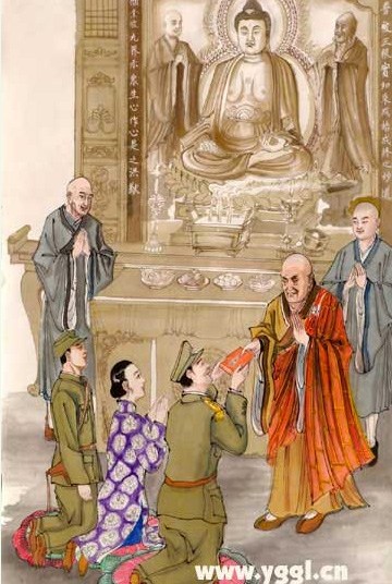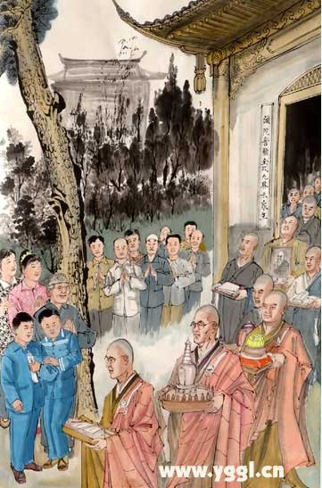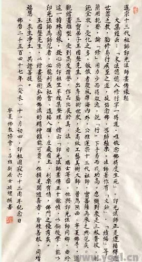 居士国声 画传缘起 大集经云:【末法亿亿人修行,罕一得道,唯依念佛,得度生死】印光法师正是遵循释迦世尊之教劝修易行疾至之道,提倡念佛导归极乐。法师著作有【文钞】【续编】等,简明扼要,论【修】用力少而得效速,说【行】下手易而成功高,应机对象是三根普被,利钝全收,受化之多皈依者众,风靡海内外,公推连宗十三代祖师,实菩萨再来之典范矣。三宝弟子王国声先生,出身艺术世家,是高级工艺美术大师,曾为陕西宁夏佛寺道观绘画雕塑受到高度赞誉。作品出展于美法日瑞士等国。他与印光法师同乡,由于这一特殊因缘,发心将印祖生平搜集整理绘出印光法师画传五十余幅,以饷后学,能以印光法师为师范者,必能利益社会,造福人群,庄严国土,利乐有情,佛门之优秀矣。王国声先生以绘画艺术弘扬佛法的精神难能可贵,但愿见闻随喜者,皆种善根,同增福慧,求生净土,共证菩提 。 佛历二千五百四十七年印祖圆寂六十三周年纪念日 |