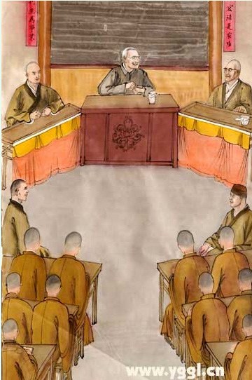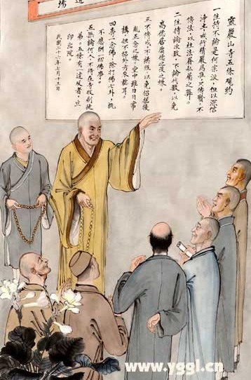 创办道场 制订规约 一九三七年大师应妙真和尚之请,移住灵岩创办十方专修净土道场,并制订了五条规约(一)住持不论是何宗派但以深信净土戒行精严为准只传贤不传法以杜法眷私属之弊,(二)住持论次数不论代数以免高德居庸德之后之嫌,(三)不传戒不讲经以免招摇扰乱正念之嫌堂中虽日日常讲但不招外方来听耳,(四)专一念佛除打佛七外概不应酬一切佛事,(五)无论何人不得在寺收剃徒弟五条,有一违反者立即出院,这五条规约是大师佛学思想的结晶,是兴净土振佛教的根本,是理想和实践相结合,实现理想化僧团组织的模式,也是近代佛教工作之纲领性文献,此后灵岩山寺就成了我国净土宗第二道场