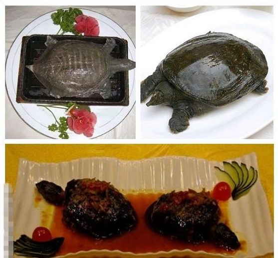 把活鸭放在微热的铁板之上,给涂着调料的铁板加温。因为热,活鸭会在铁板走来走去,到后来就开始跳。最后鸭掌烧好了,鸭子却还活着,切下鸭掌装盘上桌,鸭子做其它用。 5、铁板甲鱼
