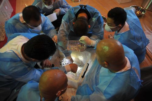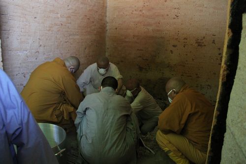 弘法网讯:4月12日,在本焕长老法体进入化身窑后的第7天,弘法寺举行了长老化身窑开启仪式。 上午9:08分,美丽的仙湖弘法寺笼罩在一片祥和安宁的气氛中。弘法寺后山长老荼毗地,由弘法寺方丈印顺大和尚、法师、居士以及安保人员等七、八十人共同参与和见证,在一片诵经声中,印顺大和尚亲自将本焕长老化身窑徐徐开启。据目击者透漏,已经看到很多舍利,因其和骨灰、龛木灰、炭灰等混合在一起,工作人员正加紧进行灵骨和舍利的分拣工作,具体的舍利数目和形状将随后公布。 一代高僧、当代佛门泰斗本焕长老于2012年4月2日零点36分示寂。依长老遗愿,其法体停留三天供大众瞻仰,4月5日举行追思及荼毗法会。连日来,在化身窑旁一张临时搭建的帐篷内,印顺大和尚整夜打坐诵经,为恩师守夜。 在长老化身窑开启现场,印顺大和尚表示:感谢十方善信、社会各界的支持,使长老后事得以圆满;同时,迎请灵骨舍利等也是遵照长老生前嘱托及按照丛林古制如法进行,也一定会圆满,请大家放心。
