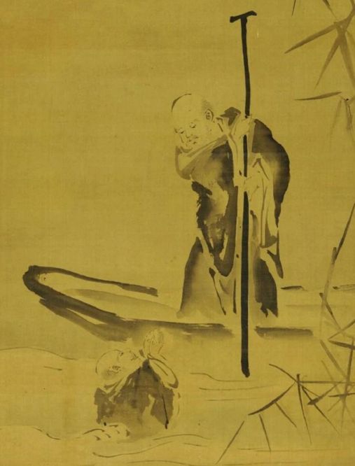 这幅图描绘的是禅宗极为有名的公案,说的是唐代夹山善会禅师被船子德诚禅师三次打入水中而开悟的经过。唐代的夹山禅师是一位有名的大法师,他佛法好,学问好,讲经说法,听众极多,名气大得很。有一次讲经时,有人问:“何为法身?何为法眼?” 他答:“法身无相,法眼无暇”,这从教下讲是圆满的,可是台下有个道吾禅师却噗哧一笑,夹山禅师知道事出有因,便下坐虚心请教,道吾禅师告诉他“你说的错倒没错,只是没有亲自证得,没有亲身体验过佛法的妙味,别人也不能通过你的说教证得佛法,体验佛法的妙味,你说的这些都不是当下能成佛的法,而想得到当下能成佛的法必须有师承”。 夹山禅师还想继续求教,道吾禅师没有直截回复,却把他转介给船子禅师。夹山禅师到船子禅师处一见面,船子禅师连问夹山禅师几个问题,结果夹山禅师都依教理圆满地回答了。 没想到船子禅师却把脸一沉,呵斥道:“一句合头语,万劫系驴橛”。合头语就是圆满的答案,因为这些都是文字知解上的东西,心上未能悟到,不能契入大般若境界,这些知解上的东西,都是意识的境界,在实际禅修时全都用不上。 船子禅师又说:“垂丝千尺,意在深潭;离钓三寸,子何不道?”是说像钓鱼一样放那么长的线下去,现在就差那么一点点了,也就是说,你下了那么多功夫,你想悟道,你想成佛,现在悟道,成佛的准备工作已经做得差不多了,你怎么不跟我说说当下怎么悟道,当下怎么成佛呢? 夹山禅师是有名的大法师,三藏十二部、唯识、中观什么都会,样样讲得通,正想给船子禅师高谈阔论一番,刚要开口,却被船子禅师一船杆打入水中,人一入水要被呛水,还要憋气,好危急,头刚一冒上来,船子和尚就催他“快说!快说!” 气都喘不上来,人还在水里,夹山禅师却还想发表演说,就又被船子禅师用船杆按入水中,又刚冒出水面,船子禅师又逼他“快说!快说!” 刚要开口却又被按入水中,如是三番,夹山和尚豁然大悟,乃向船子禅师点了三下头。你想,人被按入水中,时刻有生命之忧,呛水之难,气都上不来,哪还有心思讲经说法,这时满腑经纶,无量才艺,早到九霄云外了,精神高度警觉,大脑空空,什么妄念都没有了,当下契入明空双运境界。船子禅师就是用这个方法硬是让夹山禅师开悟。 然后告诉夹山禅师:“我在药山禅师那里参学三十年,只是搞清楚了什么是本来面目,你现在已经得到了,以后你不要再住在城市人多的地方,要到深山里人烟稀少的地方去保任这个境界。” 夹山禅师告别师父,边走边回头,一是舍不得离开师父,二是心中想,难道佛法就这么简单吗!我多年的世间学问,三藏十二部的佛法……众生贪嗔痴慢“疑”嘛!夹山禅师对此有些怀疑…… 船子禅师看明白了夹山禅师的心思,大喊一声,夹山禅师回头一看,船子禅师竖起船杆说:“汝将谓别有?!”是告诉夹山禅师“你不要认为另外还有成佛的法!”于是就把船弄翻,自己淹死了。 夹山禅师这回就死心塌地,头也不回地走了。 禅师用生命为坚定弟子信心,这就是一代祖师的风范,这就是为法捐躯。憨山大师对此曾有拈提说“假如夹山那时还停留在文字知解上,船子如何为他舍得命来”。 可见,“顿悟”、“见性”重要,对“顿悟”而“见性”的见解有坚定的信心,即“定解”更重要。此后,夹山禅师独自在山中闭关十多年,长养圣胎,刻苦修行,然后才出来弘法。 |