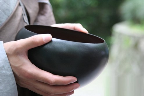 钵为比丘六物之一,又称钵多罗、钵和兰等,为如法之食器,应受人天供养所用之食器,又为应腹分量而食之食器,故又译作应器、应量器。钵的形状:呈矮盂形,腰部凸出,钵口钵底向中心收缩,直径比腰部短。 在律制上,规定钵有“体”、“色”、“量”等三法。 体 “体”指钵的材质。《四分律》中提及钵之种类云:“钵者有六种,铁钵、苏摩国钵、乌伽罗国钵、优伽赊国钵、黑钵、赤钵。大要有二种,铁钵、泥钵。”禁止使用由木、石、金、银、琉璃、宝、杂宝所作成的钵,并以此简别在家和外道。 色 “色”指钵之颜色。《四分律》限用黑、赤两色,《五分律》限用孔雀咽色。除此“黑、赤、灰”三色之外,不准熏染其他颜色。 量 “量”钵的容量。《四分律》卷九举出大、中、小三种。大者三斗,小者一斗半。但是根据唐代的量法,应是一斗至五升之间。 比丘不得储存多钵,护持钵当如护持自己眼睛一般,应当常以澡豆洗净除去垢腻。钵损坏时,若五缀(五种修补方法)而不漏,则不得求新钵(经修补后再用的钵,即称五缀钵)。钵置于地上时,若有转倒之虞,则当作钵支以安置之,携带时则应收入钵囊(或称钵袋、钵络、络囊)。 钵的由来 据《佛本行集经·二商奉食品》中说:佛陀初成道时,北天竺有帝梨富娑与跋梨迦两位商主,将“糗酪蜜搏”供养佛陀。 佛陀思惟:往昔诸佛,皆是持钵受供,我如今当以什么器皿受二商主食物供养。这时四天王知晓,立即以金钵奉上,佛不肯受。四天王又以银钵、玻璃钵、琉璃钵、赤珠钵、玛瑙钵、砗渠钵相继奉上,佛陀皆不受。 这时四天王以石钵奉上,佛陀又思惟,如若只受一钵,其他三位天王必将产生烦恼。佛陀将四钵相叠安置在左手,再以右手按下,合成一钵。而说偈言: 我昔功德诸果满,以发哀悯清净心; 是故今四大天王,清净牢固施我钵。 包钵的袋子,称为钵袋或钵囊。为三种袋(钵袋、药袋、杂袋)之一。《有部毗奈耶杂事》讲到有比丘走路时以手持钵,不慎摔破,后来佛陀教其以衣角裹之,还是又摔破。最后佛陀便教其制钵袋放置。现在的钵袋,挂于肩上用于行路时装钵,其材料及大小并没有特别的规定,被列为尼师坛的特物(随物)之一。 |