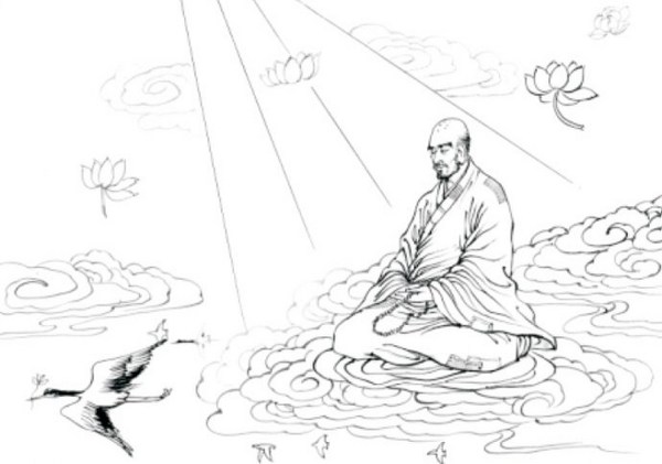 八、照公定中 见师侍佛 当时,法照大师在庐山修禅定。一日入定,往极乐世界,见一褴褛僧人侍立在佛侧,询知是南岳的承远大师