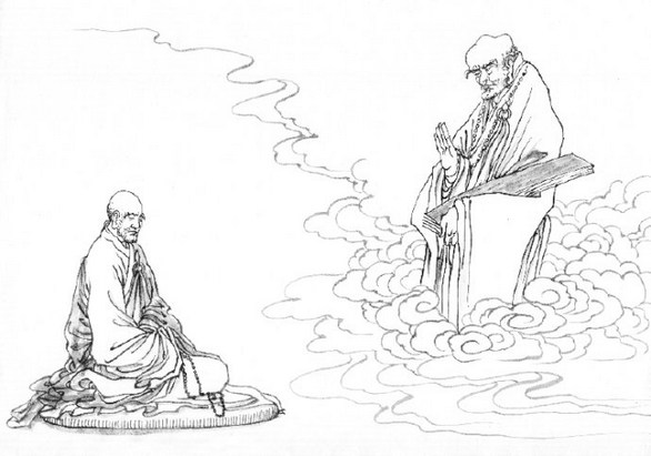 七、亲见文殊,示以念佛 大师向二大菩萨恭敬顶礼后禀问:“末代凡夫,知识浅劣,佛性无由显现,未审修何法门最为其要?”文殊菩萨回答:“汝今念佛,今正是时。诸修行门,无过念佛,供养三宝,福慧双修。我于过去因观佛故,因念佛故,因供养故,今得一切种智。”大师又问:“当云何念?”文殊菩萨开示:“此世界西有阿弥陀佛,愿力难思,汝当系念,令无间断,命终决定往生。”