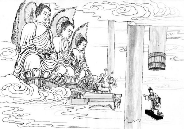 七、瞻礼导祖,感影慈教 尔后,大师往诣长安光明寺善导大师的影堂,恭敬瞻礼,大陈荐献。乞求发愿欲见善导大师,诚心所感,导祖真像化现佛身,指示少康大师曰:“汝依吾教,广化有情,他日功成,必生安养。”